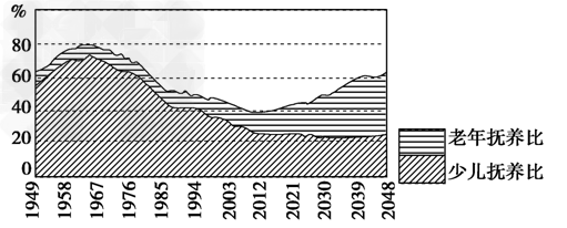 年龄人口与劳动年龄人口的百分比)在50%以下的时期称为“人口红利期”。下图是我国人口抚养比变化图,读图回答1~2题。