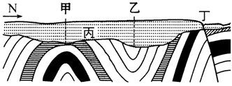 (2)写出图中各点的地质构造类型:甲 ,乙 ,丁 。(3分)