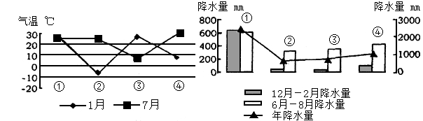 2、单选题 下图表示的是①、②、③、④四个地区的气温和降水等气候资料,据此回答问题。