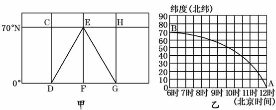 3、单选题 下面甲图为某日北京时间为12时的太阳光照图,图中DE、EG为晨昏线,乙图表示甲图中某一经线上该日各纬度的日出时间。读图回答3~4题。