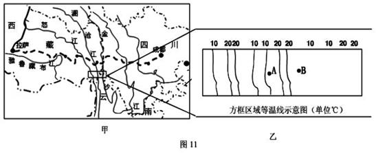 (1)甲图方框所示地区某季节的气温分布如图乙所示,试根据等温线的分布特征说明该地地形特点。(6分)