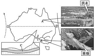 4、综合题 2009年2月的澳大利亚,当东南部备受高温干旱和山林大火之苦时,东北部又遭受洪水侵袭,澳洲处在一片“水深火热”之中。据此读图,完成下列问题。(11分)