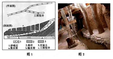 图1是坎儿井构造示意图,图2是坎儿井景观图。