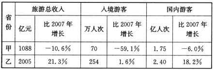 材料二:甲、乙两省份2008年旅游业数据统计表
