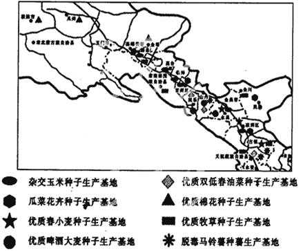 (1)甘肃河西走廊位于我国西北内陆地区,纬度较高,冬季气温低,病虫害较少,属于温带大陆性气候,降雨稀少,光照强,昼夜温差大,有利于农作物种子干物质的形成,南侧祁连山脉位于青藏高原边缘,海拔较高,山上有永久冰川,冰雪融水和部分地下水提供了灌溉资源,加上夏季降水偏多,可以满足农作物对水源的需求,河西走廊地势较低平,耕地较多且集中,沙性土壤,土质疏松,肥沃,有利于农作物的生长。