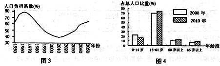 2、单选题 读图3我国人口负担系数曲线图[人口负担系数为(14岁及以下人口数+65岁及以上人口数)/(1 5,-64岁人口数)×100%]和图4我国人口年龄构成图,完成4-6题。