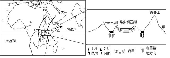材料二?下图(图8)中甲图为非洲及周边地区略图,图上标出了1月和7月的风向,乙图为非洲东部部分地区的地形和构造剖面示意图。、