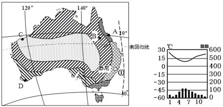 3、填空题 2015年第16届亚洲杯足球赛正在澳大利亚举行。下面左图为“澳大利亚自然带分布示意图”, 右图所示的气候类型发育的自然带与D自然带一致。据此完成下列问题。(7分)