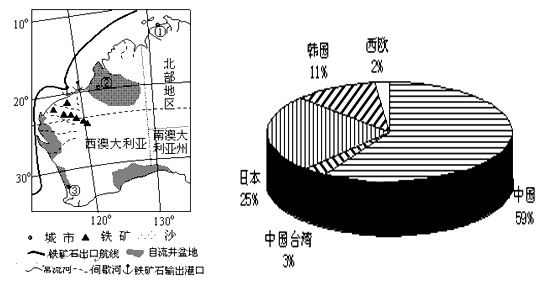 (1)据图说明澳大利亚铁矿石开采、出口的有利条件。(6分)