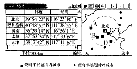图3 3S技术的综合应用 (1)GIS具有强大的查询功能,根据图1显示的查询半径,图中以北京为查询中心的地图比例尺为____________。根据图中显示的经纬度可知,地图中代表呼和浩特、济南、太原、天津的字母分别是_______________。