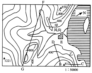 (1)B位于山顶甲的?(方向),D、G两地的相对高度是?。(2分)