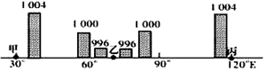 2、填空题  图为某年4月5日海平面气压(百帕)分布图。读图,完成下列要求。