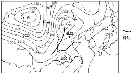 (3)图中A天气系统为    锋,该锋面到达北京时,北京的天气特点是