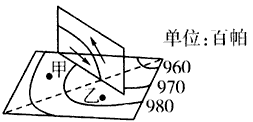 【小题1】两点之间气压差值的计算方法可参照两点之间相对高度的计算公式:(n-1)d<△H<(n+1)d;d为两条等压线之间的气压差,n为两点之间等压线的条数;图中可以看出①②之间的等压线条数有4条,可得15<△H<25。所以A正确。