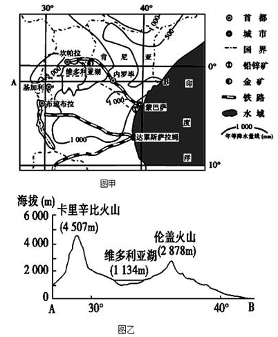 1、综合题  根据图文材料(图甲为“肯尼亚及毗邻国家略图”,图乙为“图甲中沿AB线地形剖面示意图”),农业是肯尼亚的支柱产业之一。近年鲜花产业发展较快,出口鲜花约占欧盟市场的1/3。内罗毕主要工业部门有烟草、食品、纺织、制革等,蒙巴萨主要工业部门有炼油、修船、水泥等。肯尼亚航空业较为发达,与30多个欧美国家和地区通航。完成下列问题。(18分)