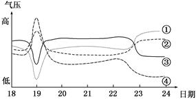 【小题1】19日,登陆后的台风中心经过了我国南方某地,继而在23日该地又迎来冷空气过境。下图四条曲线中,能正确反映从18日到24日该地气压变化特点的是( )