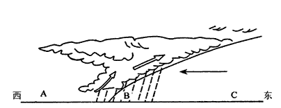 4、综合题 读“锋面示意图”,该锋面自东向西移动,回答下列问题。