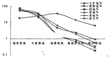 浙江省地属南方低山丘陵红壤区,浙江省独特的“水”、“土”和“植物”的时空组合,决定了浙江省水土流失的特征。下图为浙江某地不同土地类型水土流失强度分布的对数曲线。读图回答问题。