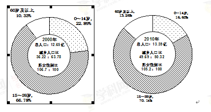 从图中可以读出,2000年到2010年,我国总人数增加,劳动力人口(15-59岁)比重增加,老年人口(60岁及以上)比重增加,所以,劳动力总数老年人口数量都在增加。城乡人口比例增加,说明城市人口所占总人口的比重增加,城市化速度加快。男女性别比大于100,并有所降低,性别比例渐趋均衡。