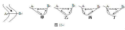 5、单选题 图15中,左侧是河流某段的平面示意图,甲、乙、丙、丁是沿A—B作的河床剖面图,箭头表示水流方向,读图完成44-45题: