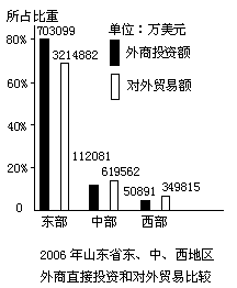2006年山东省东、中、西地区外商直接投资和对外贸易分布统计图