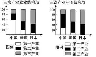 D.日、韩两国第一产业在产值和就业结构中比重都低,说明其第一产业发展落后