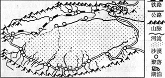2、单选题 读塔里木盆地示意图。在盆地的四周是由冰雪融水补给的河流冲积而成的冲积扇,绿洲就在冲积扇的中下部。这些地区人口集中,农牧业较为发达,交通便捷。回答下列各题。