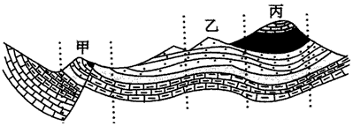 5、单选题 读“某区域地质剖面简图”,图中甲、乙、丙三处的地质构造分别是