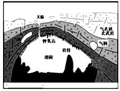 【小题2】由图可知,图中有玄武岩,是由于岩浆喷出地表而形成,故该地曾经有岩浆活动;而溶洞地貌景观一般存在于石灰岩等可溶性岩石分布区,石灰岩等属于海洋沉积环境形成,所以该地可能有海洋生物化石,故选项C正确。