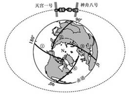 3、单选题 北京时间2011年11月3 日1时36分6秒,“天宫一号”目标飞行器与“神舟八号”飞船成功实现首次交会对接。下图是“神舟八号”与“天宫一号”首次对接空间位置示意图。读图回答问题。