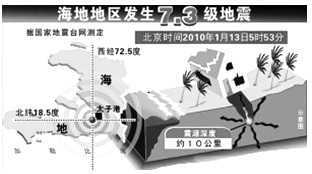 3、单选题 下图为“北京时间2010年1月13日5时53分海地(西五区)地震示意图”。读图完成1—3题。