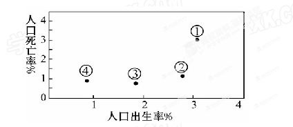 3、单选题 甲市2008年户籍人口出生9.67万人,出生率为0.699%;死亡10.7万人,死亡率为0.773%。甲户籍人口这种自然增长态势已持续14年。下图显示四个地区的人口出生率和死亡率,据此完成问题。