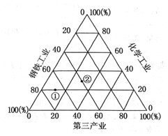 5、单选题 德国鲁尔区从20世纪60年代到80年代,经济结构进行大规模的调整,根据下图的鲁尔区产值结构图(图中①表示1958年,②表示1995年)及所学知识,判断1~2题。