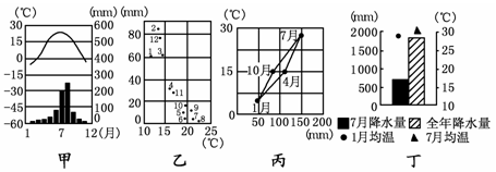 1.根据四地的气候资料分析,甲最低月温在0度以下,降水量集中于夏季,判断为温带季风气候;乙雨热不同期,判断为地中海气候;丙最低月温在0度以上,降水集中于夏季,判断为亚热带季风气候,丁地终年高温,夏季降水尤其多,判断为热带季风气候,故D项正确。