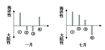 【小题1】海洋性是指气候湿润,降水量大,受季节影响小,气温年较差和日较差也较小;大陆性是指降水较少,降水量受季节影响大,气温年较差和日较差都相对较大。由图可知,①地无论1月还是7月,海洋性都强,所以终年降水较多,为热带雨林气候;②、③两地,7月即夏季海洋性②>③,冬季大陆性②<③,所以②地的降水量大,气温年较差和日较差也较小,应当是亚热带季风气候,故选项B正确。