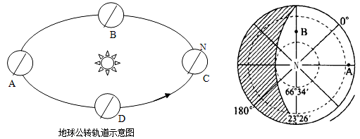 (4)左图中A、B、C、D四点,最接近地球公转轨道近日点的是 ,此时中国东部地区盛行 风。(2分)