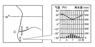 1、综合题 读世界某区域图,右侧为下图中沿海城市P地的气候资料,回答以下问题。(10分)