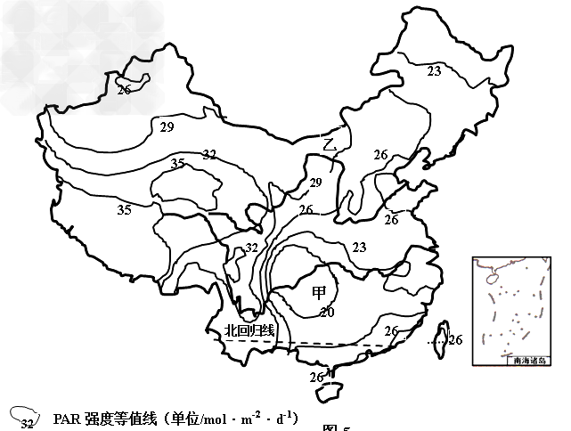 2、综合题 能被植物光合作用利用的太阳辐射,称为光合有效辐射(PAR)。下图为1961~2007年我国年平均PAR强度的空间分布。据此完成下列各题。