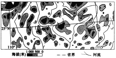 3、单选题 下图中所显示的是我国某地形区。读图完成1~3题。