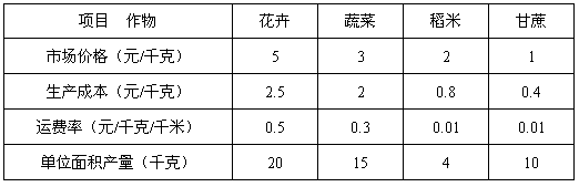 3、单选题 ? 下表为四种农作物产销资料,假如该地区是一个地势平坦的平原,可种植花卉、蔬菜、稻米和甘蔗等四种农作物,其产品全部提供某一市场消费,且地价相同,回答1—2题。