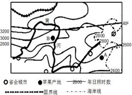 材料一:下图为某区域年太阳日照时数图,图中A、B两地是我国重要的苹果产地。