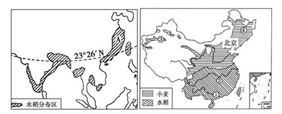 1、综合题 下图中左图为“亚洲水稻分布图”,右图为“我国主要粮食作物分布示意图”。读图完成下列各题。(14分)