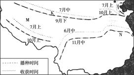 1、单选题 农业生产受自然条件影响非常明显,下图为我国某种主要农作物不同地区的农时图,其中时间为该农作物最迟的播种和收获时间,读图10完成题。