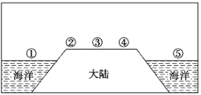 5、单选题 读“沿某一理想大陆45°N所作的剖面示意图,关于图中①②③④各地气温变化的叙述,正确的是( )