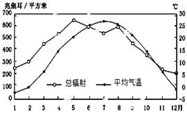 【小题1】该市最冷月均温低于零度,应位于我国秦岭-淮河以北地区;7月份,该市总辐射量较低,说明此时阴雨天气多,应该是天津。