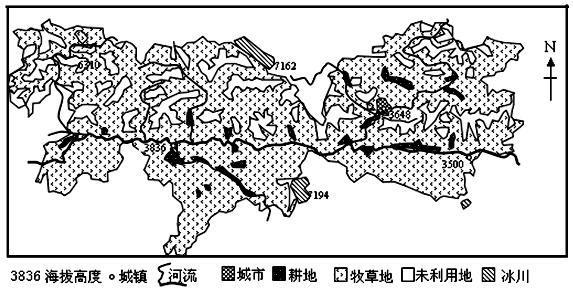 (1)由图可以看出:当地牧草地分布最多;其次是中北部有大量的未利用地,冰川、耕地和城市用地都很少。