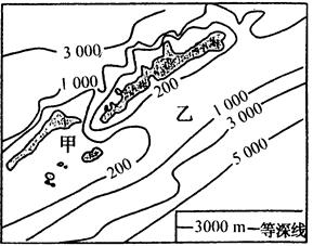 小题1:根据海底等深线的分布:甲为沿海,水深200M范围之内,表示大陆架;大陆架向外,地形坡度较大的区域,表示大陆坡;