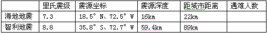 根据两国的经济社会发展水平、表中的信息可以判断,智利地震遇难人数远低于海地地震的原因是智利的经济社会发展水平高,建筑质量标准高;比较完善的地震灾害应急措施;震源深度较深;震中离人口稠密区比较远一些;居民的防震逃生意识和能力比较强;政府救援工作得力有效。