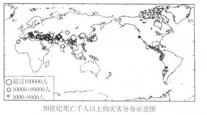 3、单选题 读“20世纪死亡千人以上的灾害分布示意图”,完成下列问题。