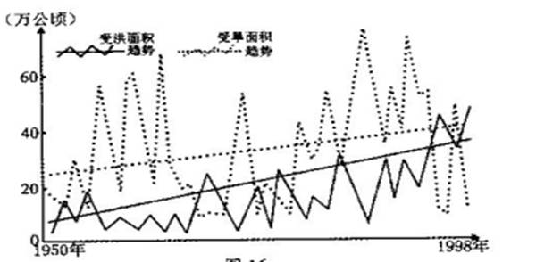 (1)说出1950—1998年该区域洪、旱灾害的变化特点,并从大气环流角度分析形成原因。(7分)